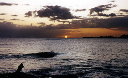 I think this was a sunset from a beach on Kauai -- the lushest of the Hawaiian Islands. I believe this would have been 1992.